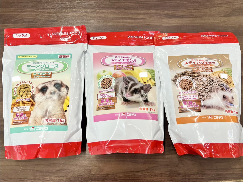 今話題のミーアキャット専用フードがお得に!もちろん食いつきも◎(左)