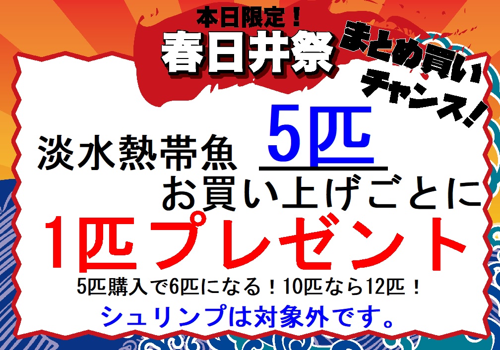月に一度の1day限定イベント春日井祭り開催。今月は1月18日限定です!毎回恒例の5匹+1匹 たとえばカージナルテトラを10匹購入していただくと12匹になるちょっとお得な1日です。