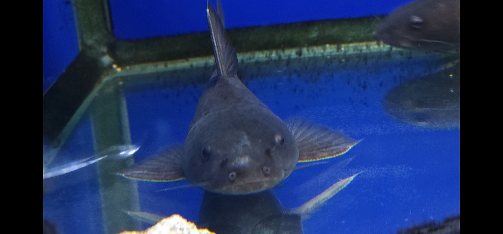 ギギの仲間の珍ナマズ。体型はギギですが体色はマナマズのように、金ピカの上から黒がのっており、動く様を見せたとききこそ本領。正面顔も愛嬌あります。