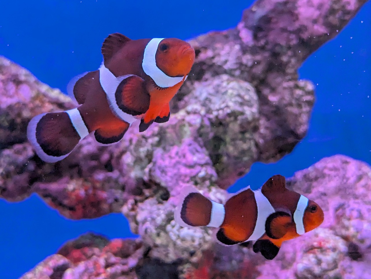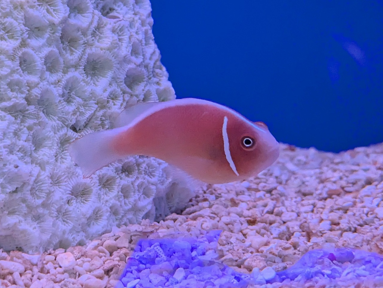 淡いピンク色で、他のクマノミと比べても雰囲気が違いますね✿