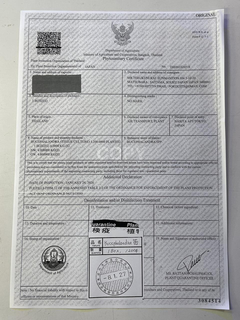 正真正銘、植物検疫証明書と到着空港の検査済証の付いたブセたちです。
