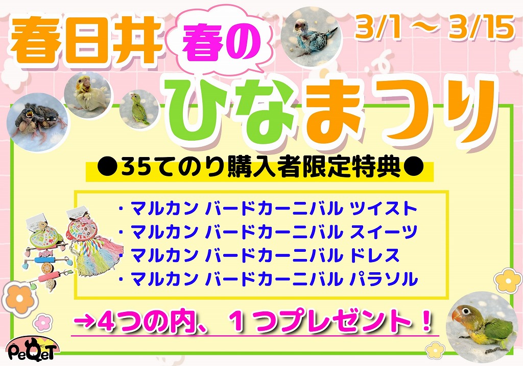 小動物の生体・用品コーナーでは『ひなまつり』を開催します🐦️