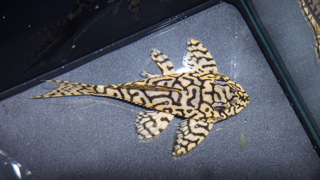 天然ハイブリッドといわれるコロンビアの珍ナマズ。恐らく50~60cmほどになると思われます。性格は悪くなく、多少の攻撃性はありますが、口に入るサイズを避ければ混泳はさせやすい方です。サイズがあえばポリプなどのニョロ系もいけます。2サイズいます。