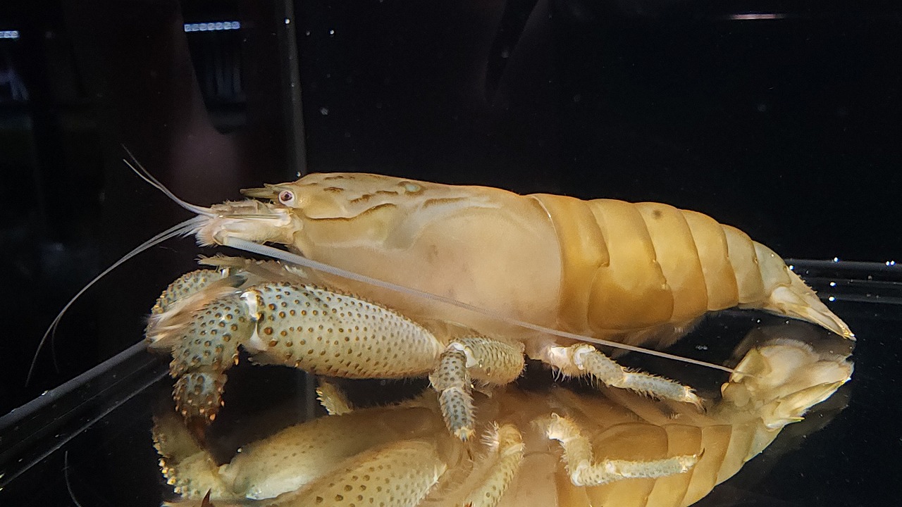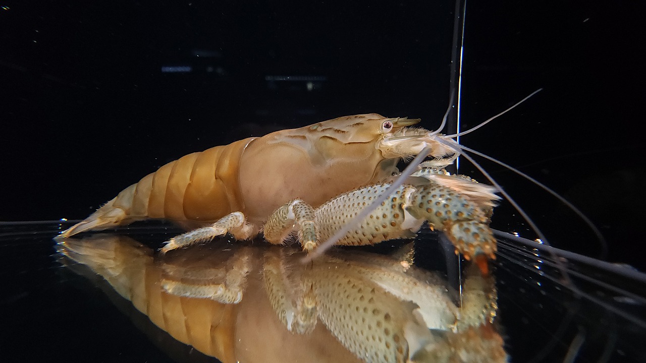 アフリカンロックシュリンプの特大サイズ。本当に同種なの?と疑うレベルでサイズが違います。このゴツい見た目からは想像しにくいですが、プランクトンを食べるため小型魚との混泳も全く問題ありません。小卵型のため繁殖(というか幼生の育成)難易度は高いですが、繁殖させている方もいらっしゃいます。