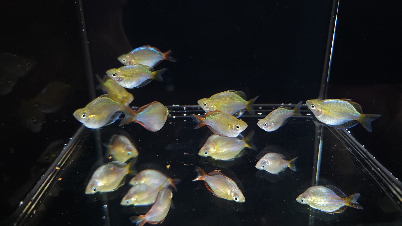 この子は恐らくロエボイデス(10~15cm程になる中型カラシン)の仲間かと思います。透明感のあるボディと細かくキラキラ光る鱗が美しいです。2匹のみ