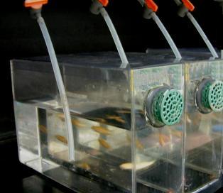 飼育タンクごとに水流の調節ができ、排水はオーバーフローでフィルターに落とされます。